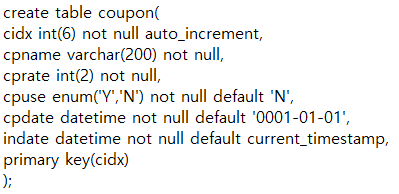① 리스트에 필요한 컬럼만 가져오면 되므로 알맞은 쿼리문 작성 -> ex ) select cidx,cpname,cprate,cpuse from coupon order by cidx desc