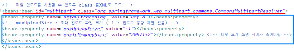 1. 파일 업로드를 사용할 수 있도록 class 를XML로 로드 -> ctrl + h 로 CommonsMultipartResolver 검색 후 패키지 가져와서 property class 로 넣기 🚨 속성 값을 정해주기 : 인코딩, 파일 용량, 업로드 메모리 etc.. ⑴ id : multipartResolver (필수로 해당 아이디를 적용) ⑵ maxInMemorySize 값이 너무 커서 수업 도중 계속 오류발생 -> maxInMemorySize 값을 200000d으로 수정함 ⑶ maxUploadSize : 최대 업로드 파일 크기 ( -1 : 업로드 용량 제한 없음) ⑷ maxInMemorySize : Tomcat에서 사용되는 메모리와 대칭이 되며 server.xml에 메모리 max에 할당되는 size만큼 적용할 수 있음 => 서버에서 할당되는 만큼 만 사용할 수 있음 (쓸수록 속도가 향상됨) 잘 못 쓰면 메모리 과부하로 서버 shutdown